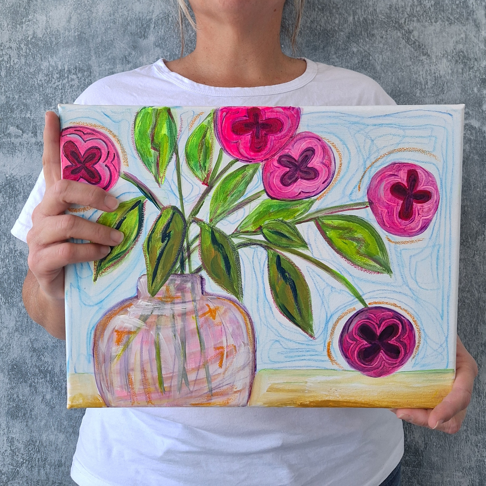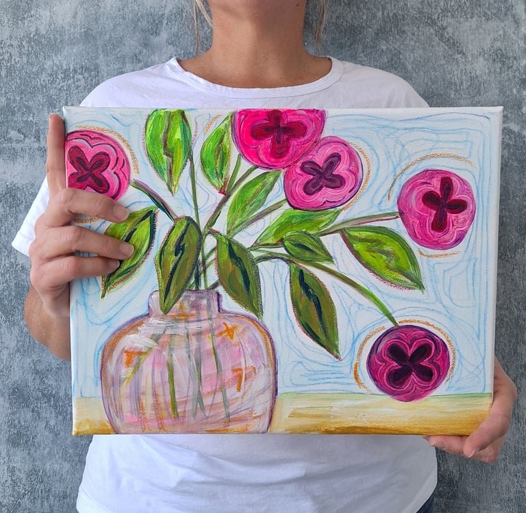 The journey of these enchanting artworks began at the start of the year when a 20"X 16" canvas titled "Flowers of my Imagination" was purchased for a little girl renovated bedroom. The collector was thrilled by the vivid colors and the emotive quality of each flower. She expressed falling in love with the distinctive charm of the imperfect yet expressive flowers.