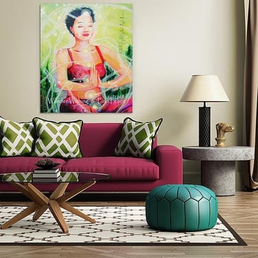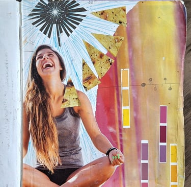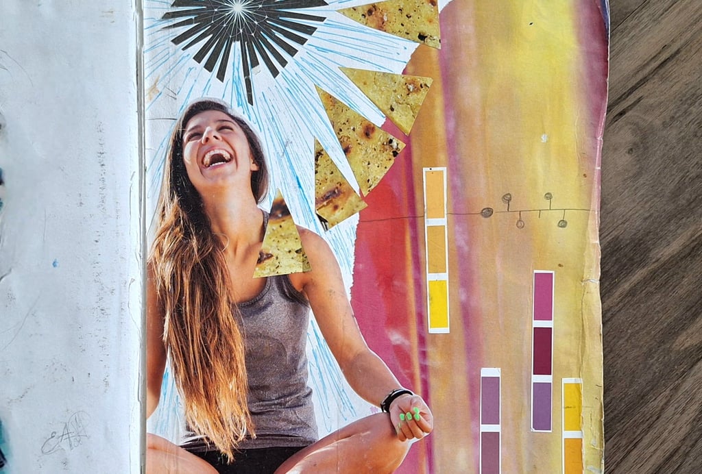 The story of "Joy" goes like this; One day as I was passing the pages of a wellness magazine I found an image of this young woman sitting in the Padmasana yoga pose (lotus pose) but instead of being with her eyes closed for meditation she was laughing her heart out, this image triggered my inspiration, I went to grab my sketch book and collect cuttings of paper from my collage box and made a collage of the image in my sketch book with the right color palette for the art.